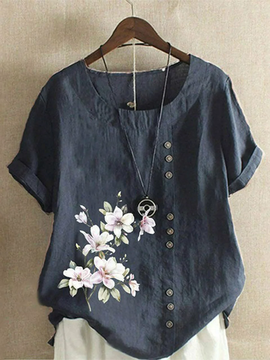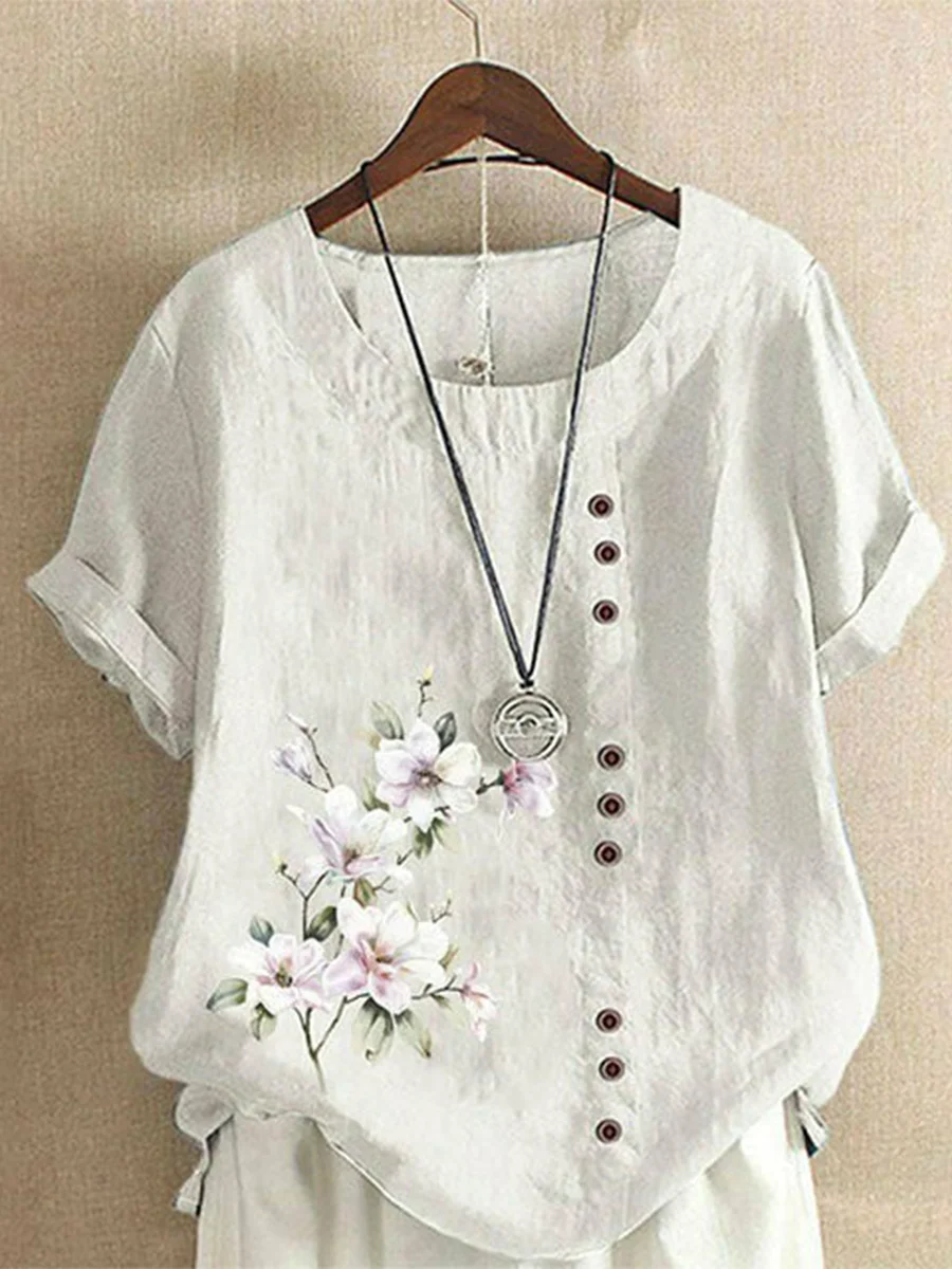 Women's Casual Round Neck Plain Buttons Short Sleeve Cotton Summer Blouse