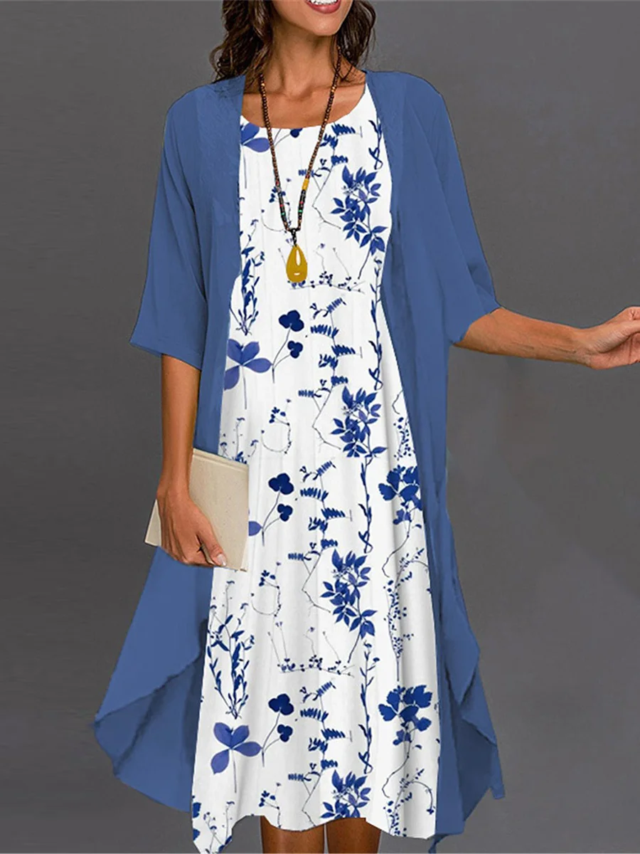 This two-piece dress is stunning! The floral pattern is beautiful, and the crew neck and half sleeves are very stylish.